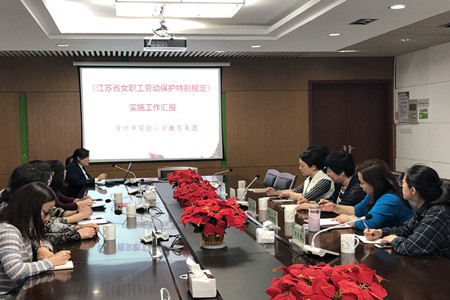 5月15日下午2点,常州市总工会副主席蒋炜、市总工会女工部部长王赟枫、副部长周凌虹、钟楼区总工会主任金铁梅、区教育工会联合会副主席周建英来到常州市实验小学教育集团平冈校区调研《江苏省女职工劳动保护特别规定》实施情况。 在实小教育集团校长杨娟玉、校党支部副书记金莉、副校长汤琰的陪同下,来宾参观了学校的爱心母婴室,参观了校园文化,并听取了平冈校区工会主席孙丹有关《江苏省妇女保护特别规定》学校的实施情况汇报:在区总工会、区教育工会联合会的引领下,学校健全女工组织,积极发挥其职能作用;积极宣传法律常识,落实女职工合法权益;通过多彩活动引领,提升女职工思想素养促《省妇女保护特别规定》落地实施。 听取汇报后,市总工会蒋炜副主席对学校工会女职工保护工作取得的成绩予以充分肯定,并听取了大家在实施过程的困惑和建议。她希望在市区工会组织的共同努力下,进一步推动《妇女保护特别规定》在基层工会落地落实;也希望学校党政的大力支持,让更多的女职工能参与学校的民主决策,享受应有的权益,爱岗敬业,积极发挥先锋模范作用。