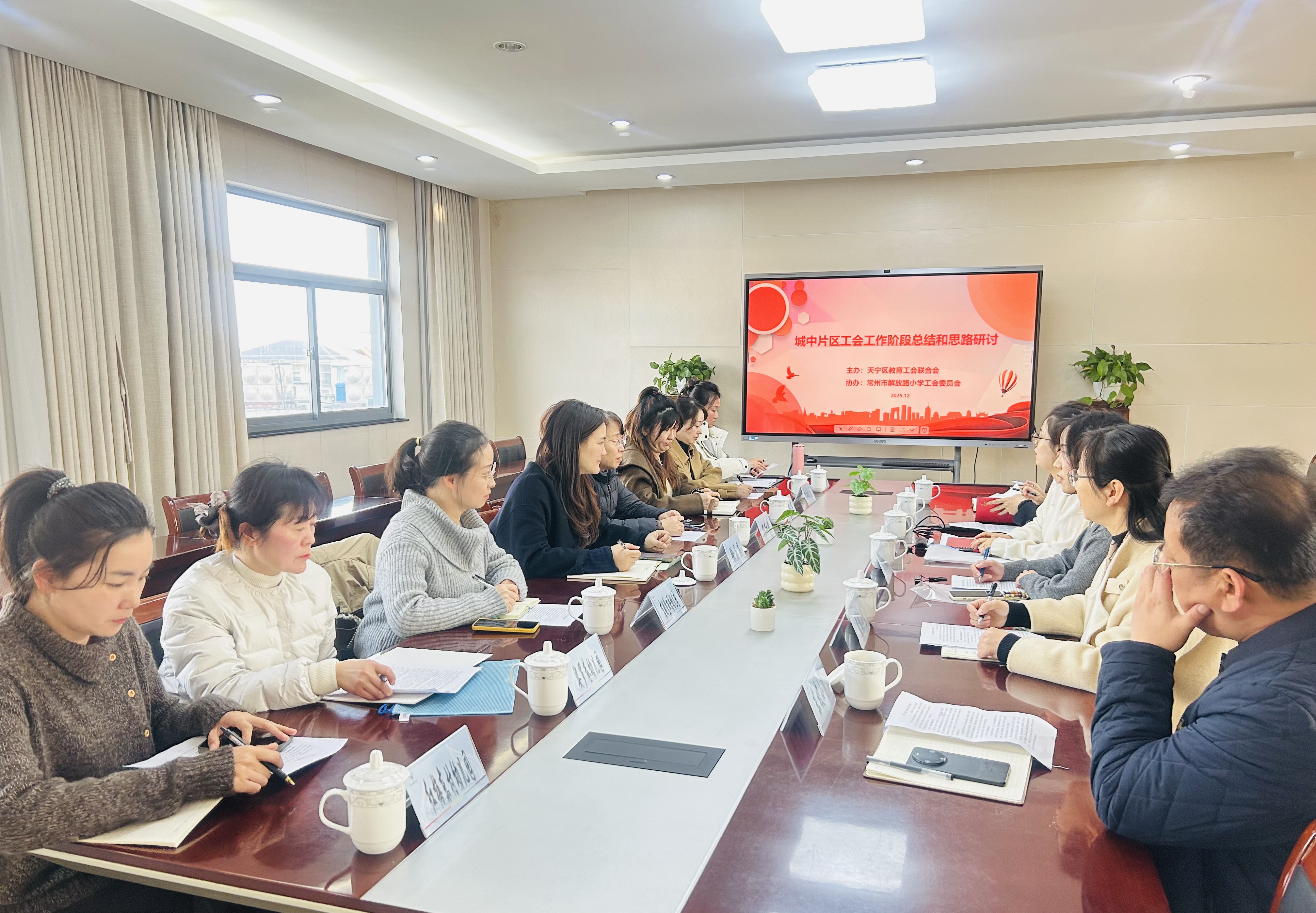 12月16日下午,天宁区教育工会联合会城中片区的工会工作阶段总结和思路研讨活动在解放路小学举行。天宁区教育工会联合会主席杨红妹、工联会副主席徐晶晶、夏丽华以及城中片区各校工会主席参与活动。解放路小学工会主席戴彩娥主持会议。